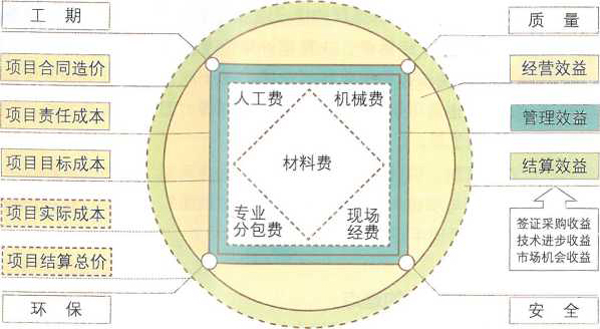 “方圓圖”是具有操作性的工具。其一,“方圓圖” 完整詮釋了建筑項(xiàng)目管理行為間的關(guān)系?!敖禹?xiàng)目”確定了合同造價(jià),對(duì)應(yīng)方圓圖的實(shí)線圓;“做項(xiàng)目”的第一步是下達(dá)項(xiàng)目目標(biāo)責(zé)任書,確定項(xiàng)目責(zé)任成本,對(duì)應(yīng)方圓圖的責(zé)任成本方形,第二步分子公司在責(zé)任書的基礎(chǔ)上進(jìn)行項(xiàng)目實(shí)施策劃,產(chǎn)生項(xiàng)目的目標(biāo)成本,對(duì)應(yīng)方圓圖的目標(biāo)成本方形,第三步就是項(xiàng)目實(shí)施過(guò)程的管控,最終確定實(shí)際成本,對(duì)應(yīng)方圓圖的實(shí)際成本方形?!八阗~收錢”就是完成項(xiàng)目過(guò)程中的結(jié)算變更與最后的決算收款,從而確定結(jié)算造價(jià),對(duì)應(yīng)方圓圖的結(jié)夢(mèng)造價(jià)虛線圓。項(xiàng)目實(shí)施過(guò)程中進(jìn)度、質(zhì)量、安全、環(huán)保及周邊相關(guān) 方的管理對(duì)應(yīng)成本方形的四個(gè)支撐頂點(diǎn),構(gòu)成成本的五項(xiàng)費(fèi)用“材料、人工、機(jī)械、現(xiàn)場(chǎng)經(jīng)費(fèi)、專業(yè)分包”對(duì)應(yīng)成本方形的內(nèi)部區(qū)域。
